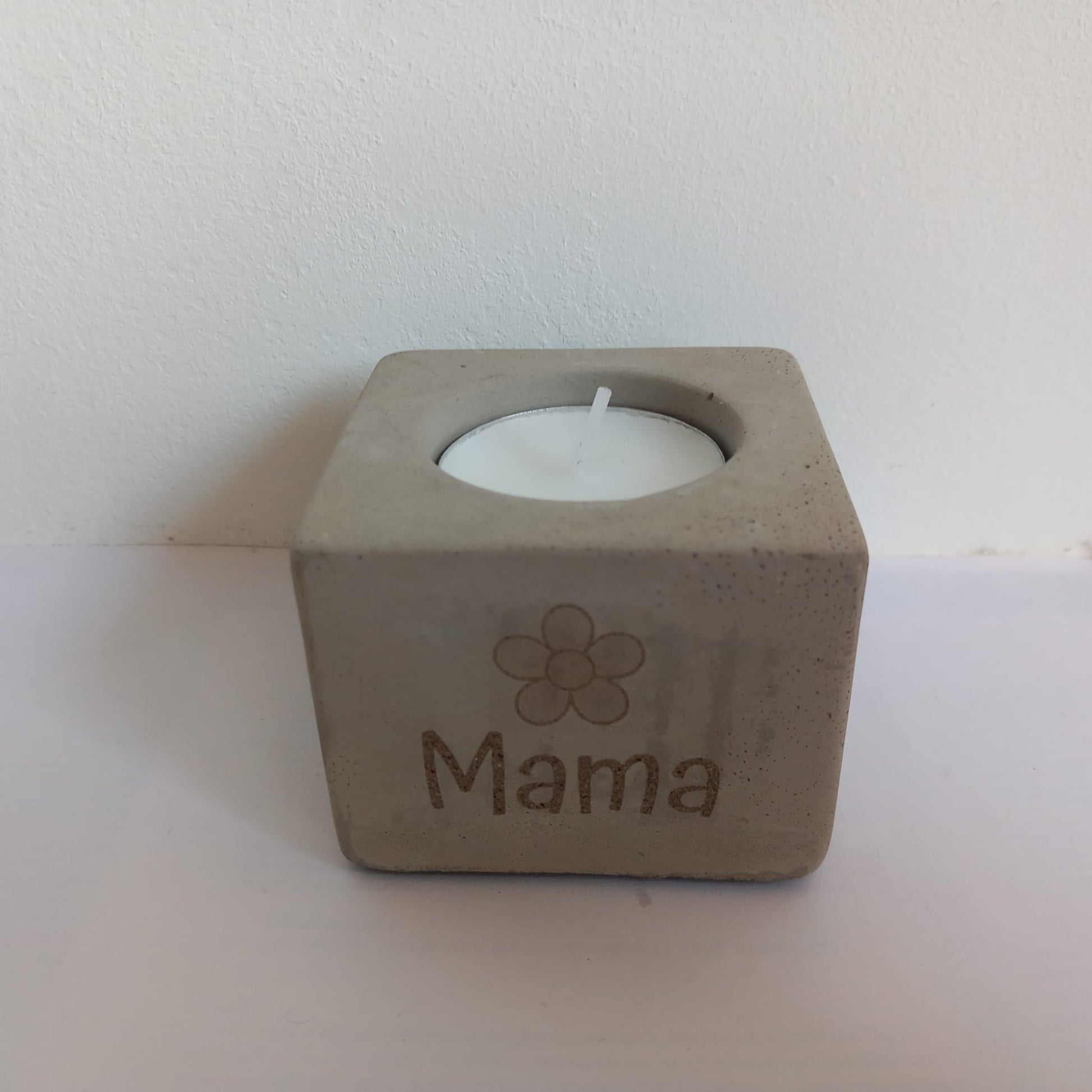 Deze kaarsenhouder uit cement kan je gebruiken met theelichtjes en grote kaarsen en zorgt voor een stevige basis op tafel. Laat deze graveren met jouw boodschap!
