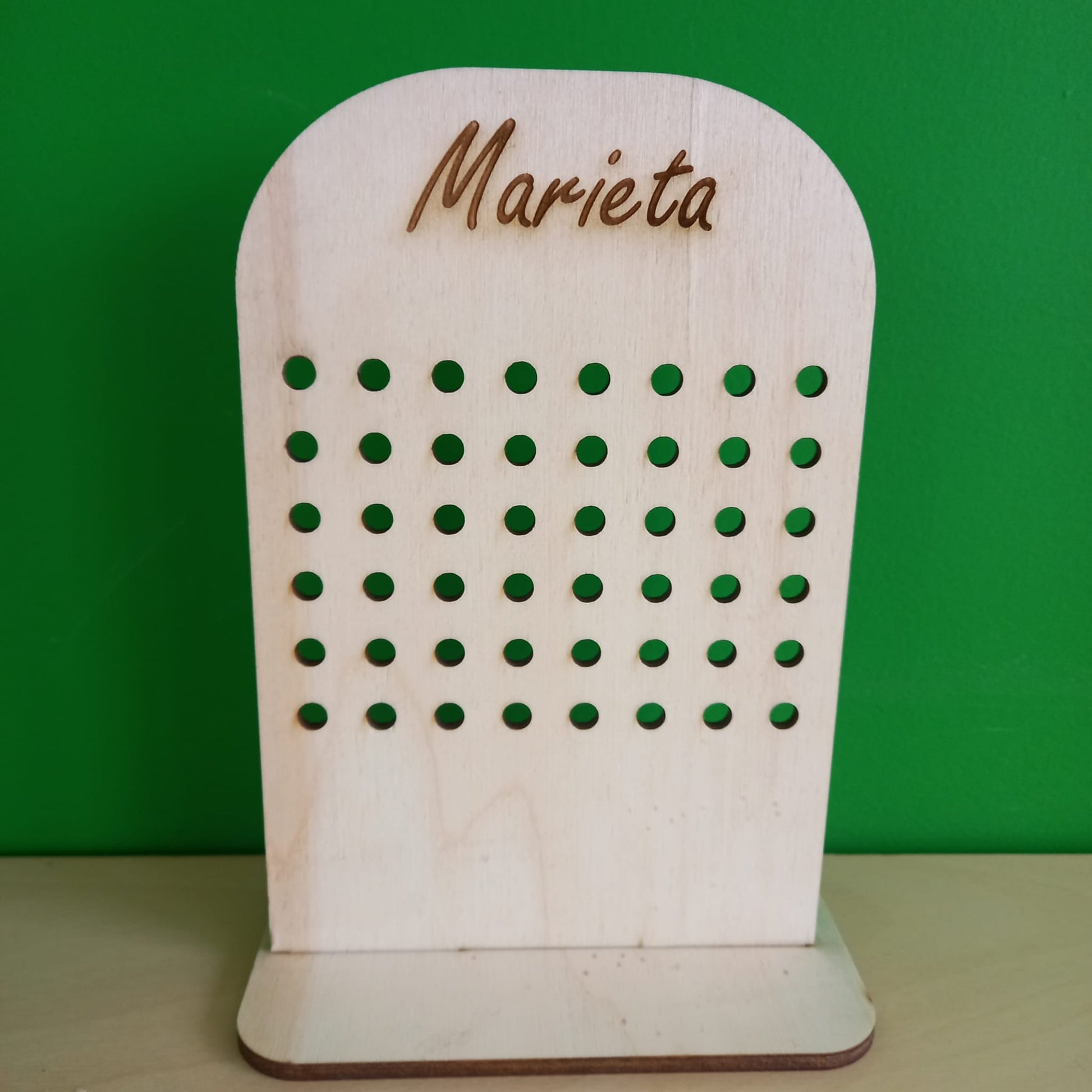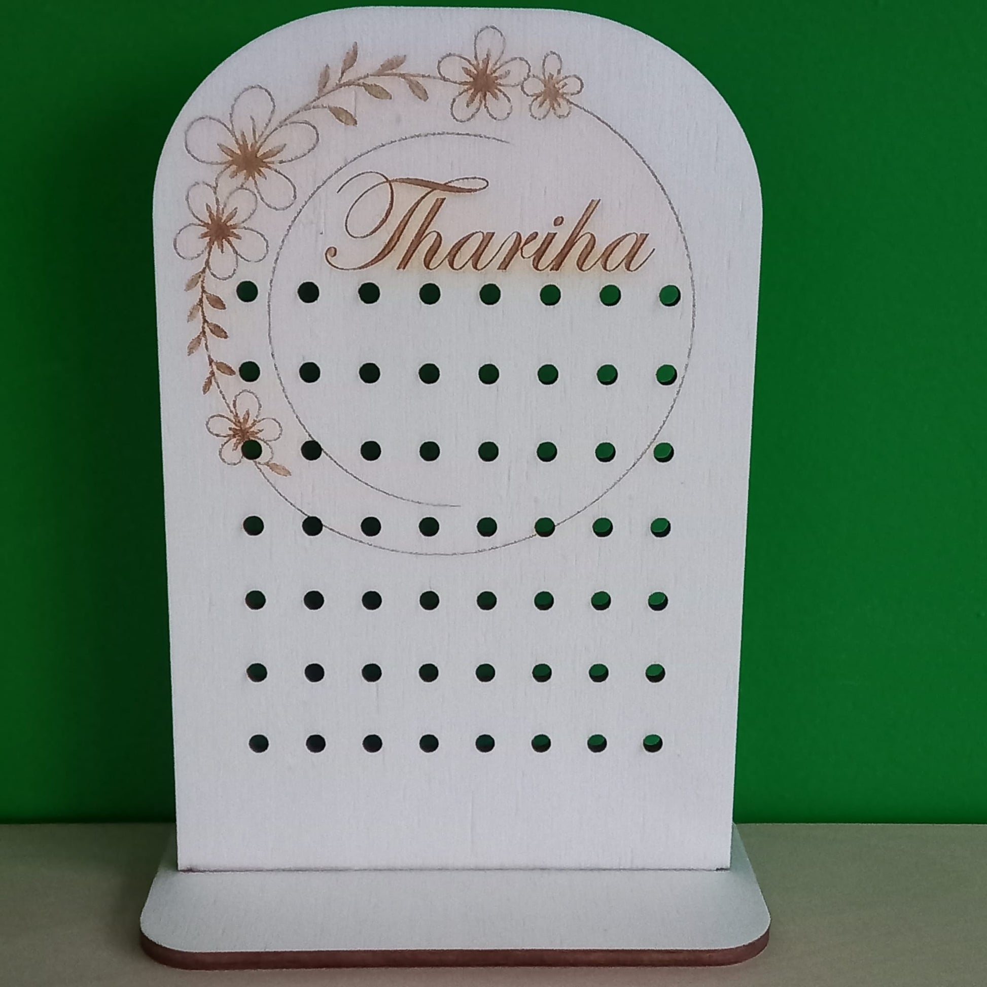 Dit 20 cm hoge oorbellenrekje is de perfecte mix van praktisch en persoonlijk. Geen gezoek meer naar dat ene paar – alles hangt netjes op z’n plek. Voeg je naam of een quote toe en maak er een uniek pronkstuk van op je kast of in je dressing.