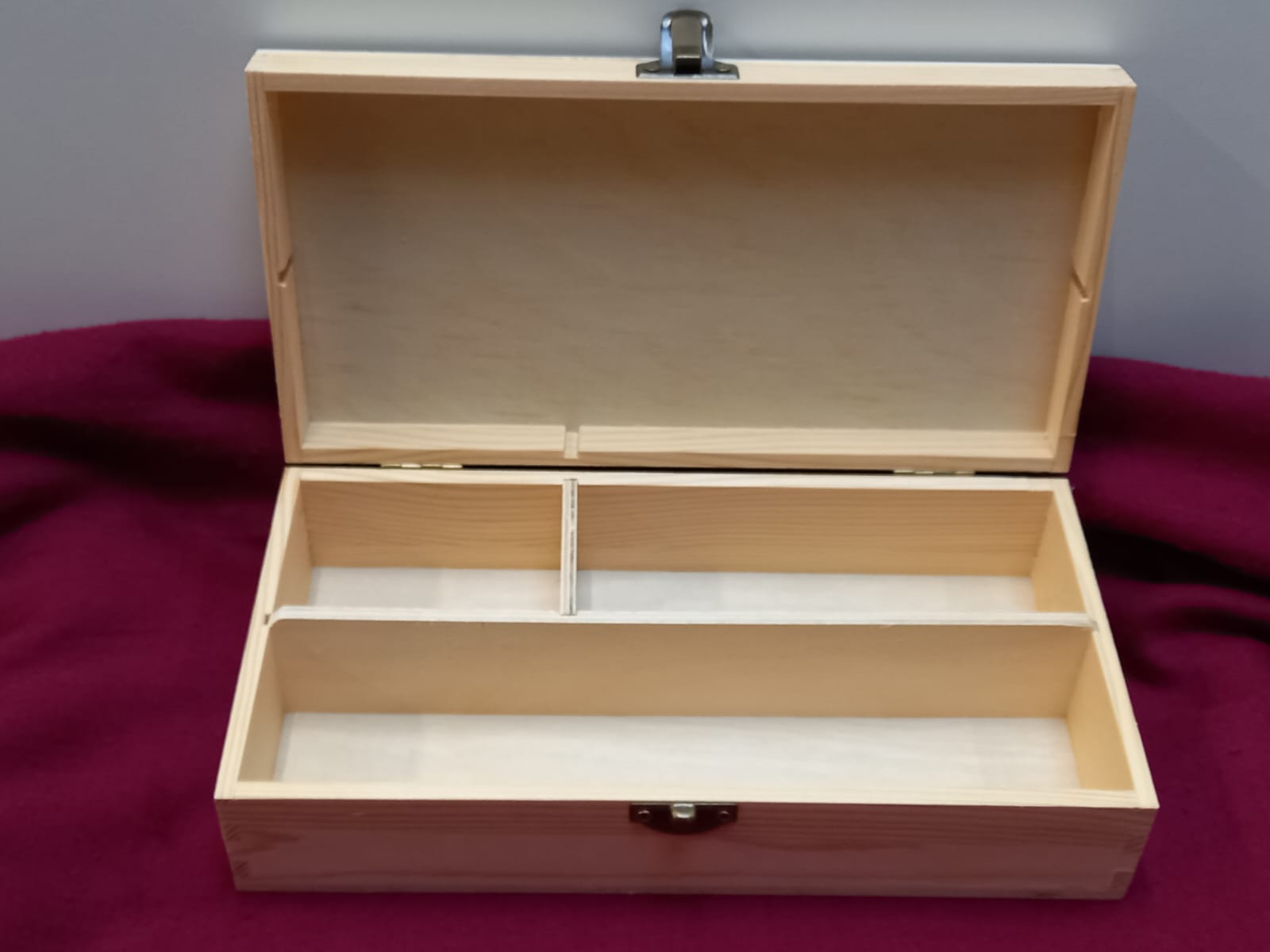 Deze houten tekendoos biedt een stijlvolle en praktische manier om al je tekenmaterialen op te bergen. Het doosje is ingedeeld in drie compartimenten. Het kistje kan gepersonaliseerd worden, waardoor het een uniek en persoonlijk item wordt. Perfect voor kunstenaars van alle leeftijden!