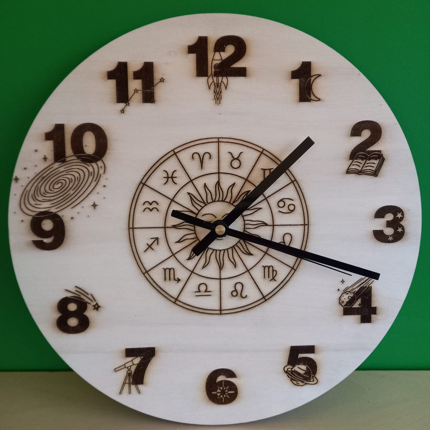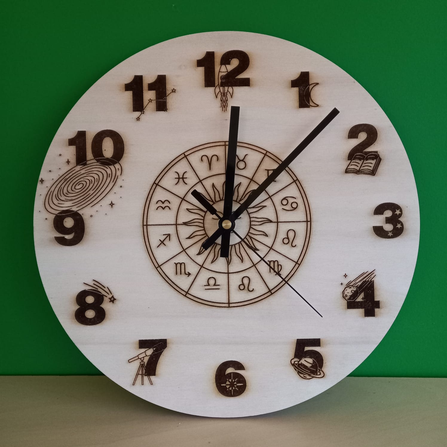 Houten astrologie wandklok – uniek en sfeervol design
