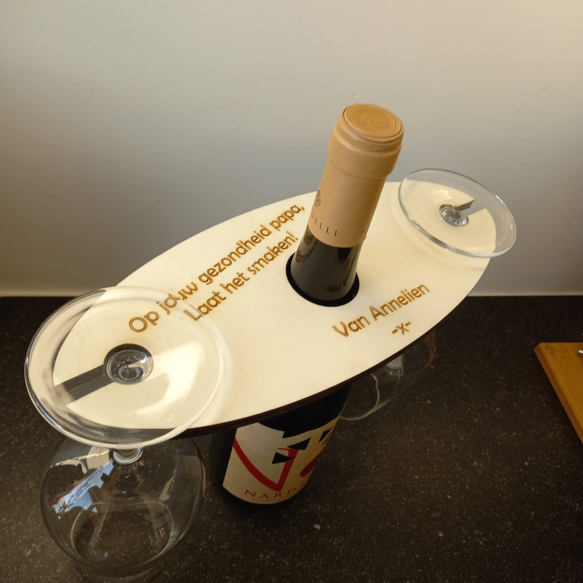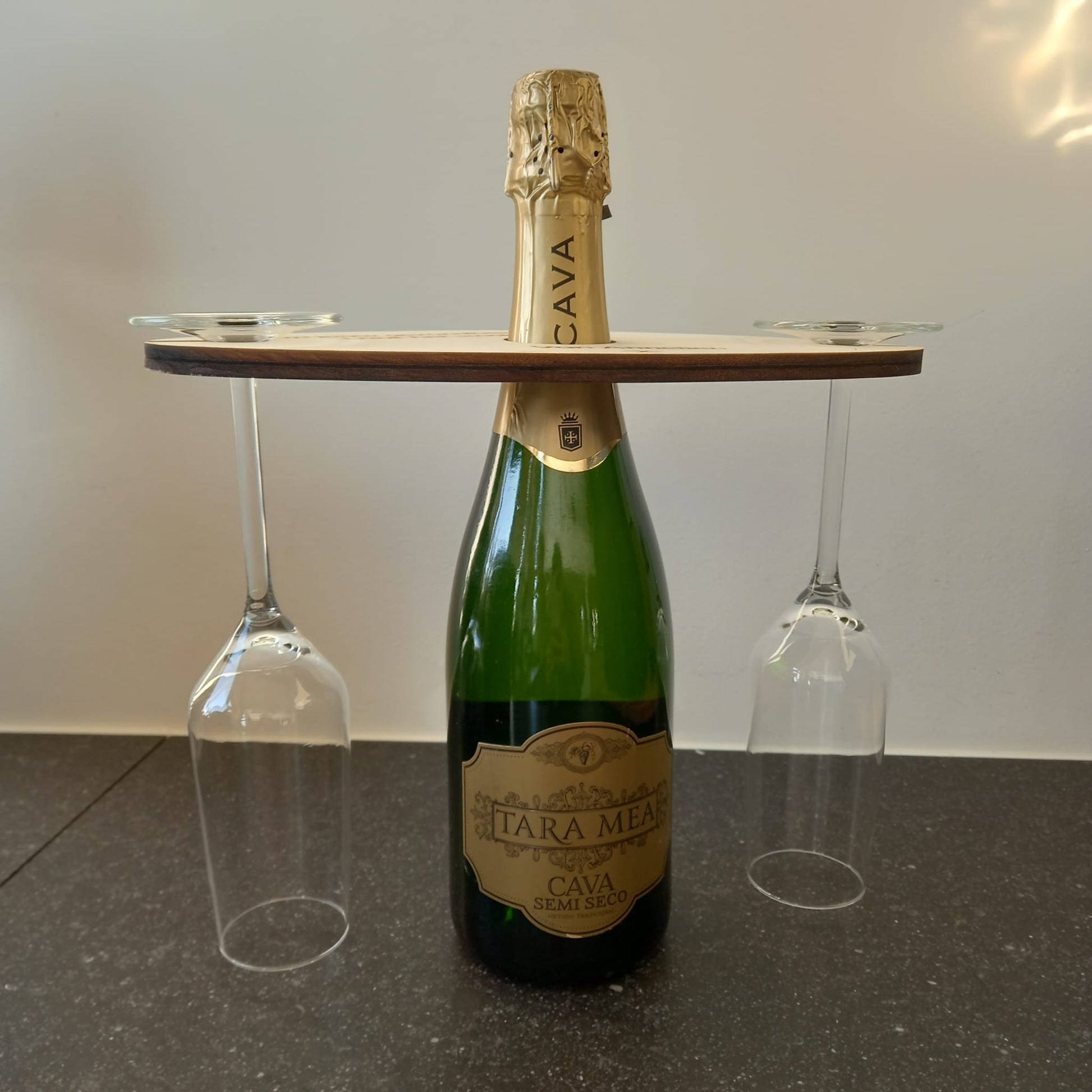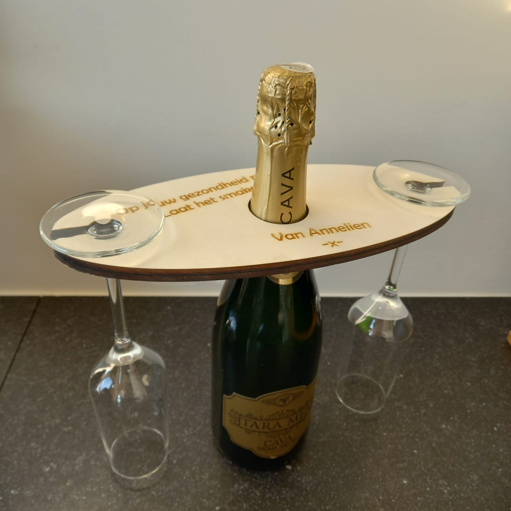 Deze wijnglazen houder wordt zonder glazen en wijn of cava geleverd. Deze is niet geschikt om bierglazen aan te hangen. (Te smal)