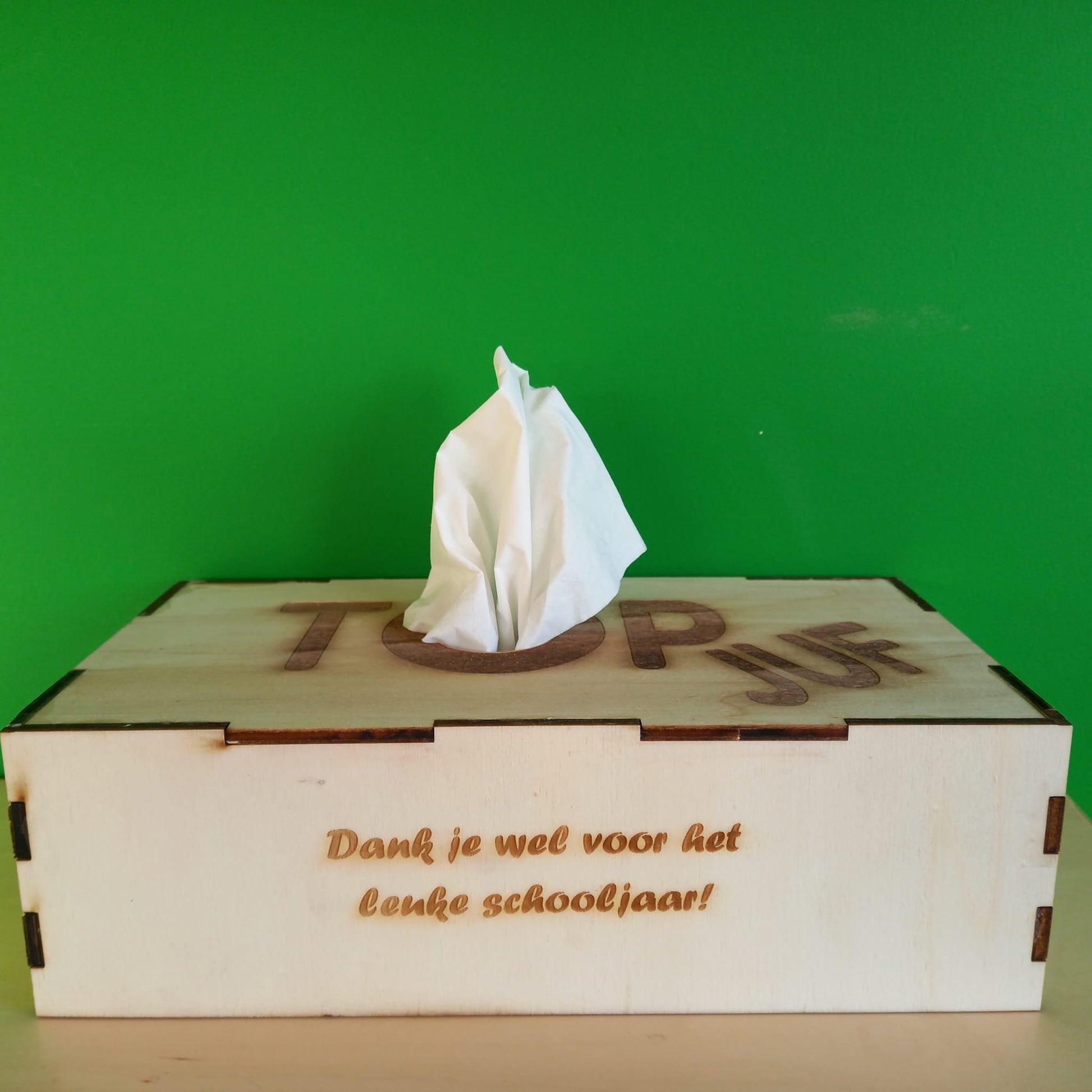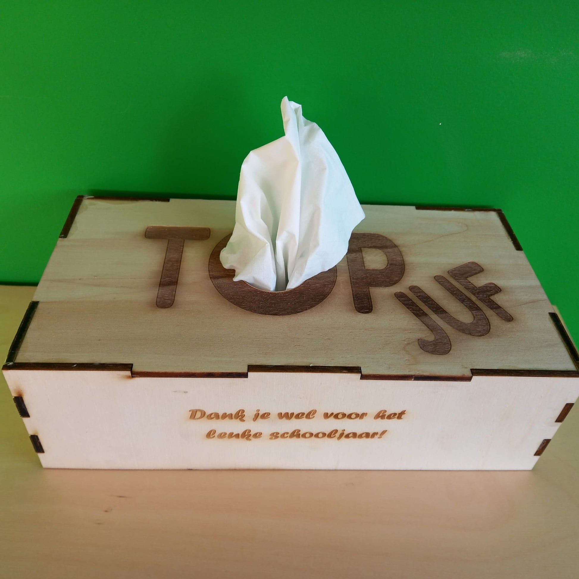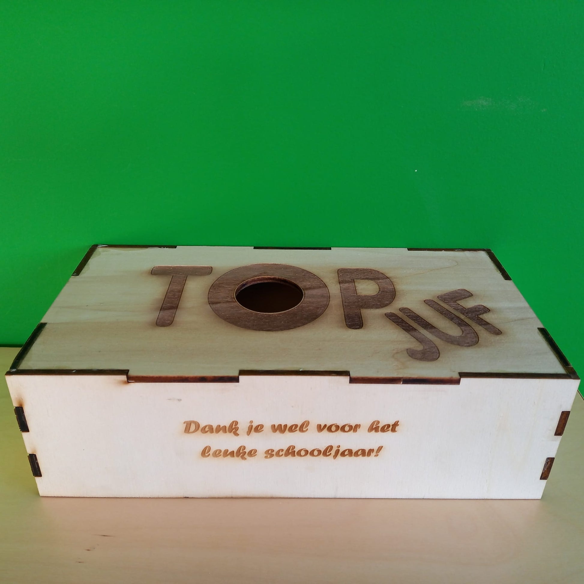 Deze mooie zakdoekendoos maakt van elk papiertje een klein feestje. Een praktisch én persoonlijk cadeautje voor die ene bijzondere juf die altijd klaarstaat.